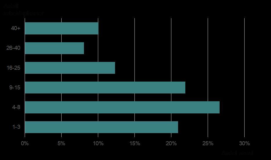For å se på størrelsen til bedriftene som benytter seg av flex-kontor har vi undersøkt antall arbeidsplasser de leier hos de ulike operatørene. Ser man på andel av unike leietakere, benytter mer enn 80 % av utvalget kun 1-8 arbeidsplasser, noe som tilsier at det, som forventet, er små bedrifter som er den største brukeren av flex-kontor.