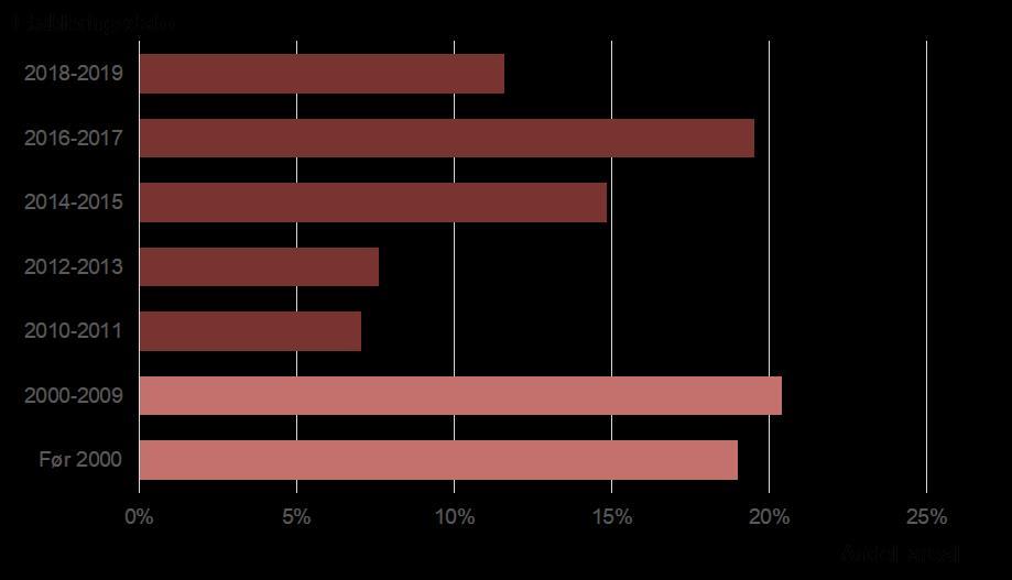 Grafen under viser leietakerareal-andelene sortert per etableringsdato, der de siste 10 årene har fått fem to-års-grupper.