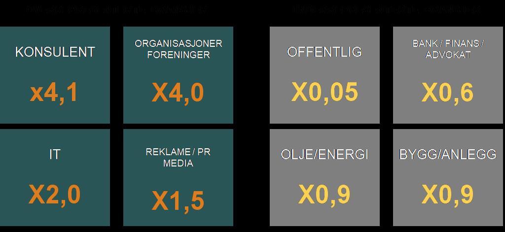 For å forstå dette resultatet bedre, sammenlignet vi hvordan de ulike bransjene i utvalget er representert i forhold til det totale utleiemarkedet. Overrepresenterte bransjer er konsulent (x4,1), organisasjoner og foreninger (x4,0), IT/kommunikasjon (x2,0) og Reklame/PR/Media (x1,5), mens underrepresenterte bransjer er bank/finans/advokat (x0,6) og offentlige brukere, der andelen kun er 0,05 av den gjennomsnittlige andelen i markedet. Det må nevnes at storparten av arealet som leies av offentlige brukere er svært store arealer på 10.000 m2 eller mer.
