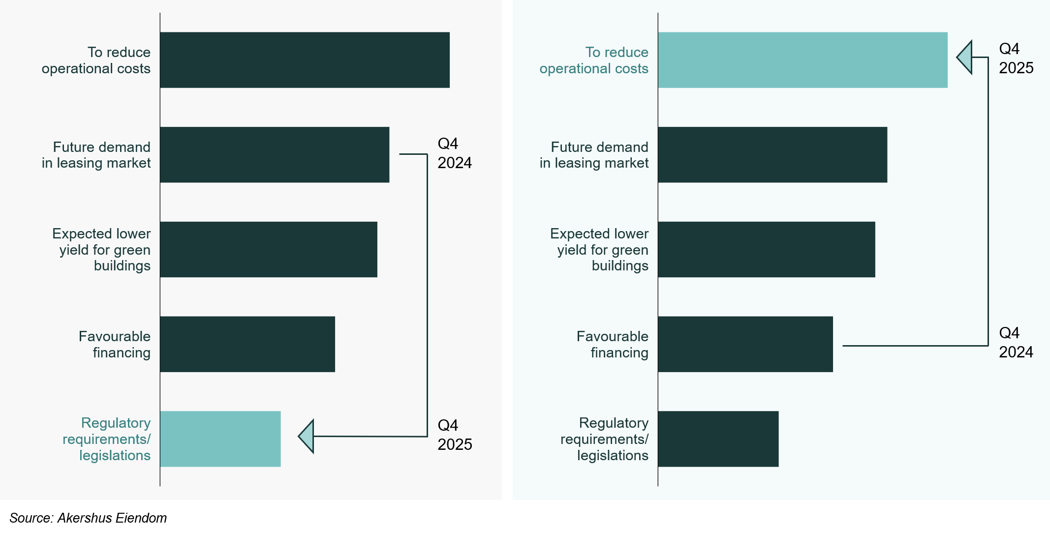 - Furthermore, we see an increased focus on cost across the entire property market, which is also confirmed by the survey results - where reducing operational costs has jumped several places and is now clearly the most important motivation for green investments. Overall, this year’s survey confirms that ESG remains an important part of the investment and decision-making framework in the Norwegian market, and we expect this to continue going forward.