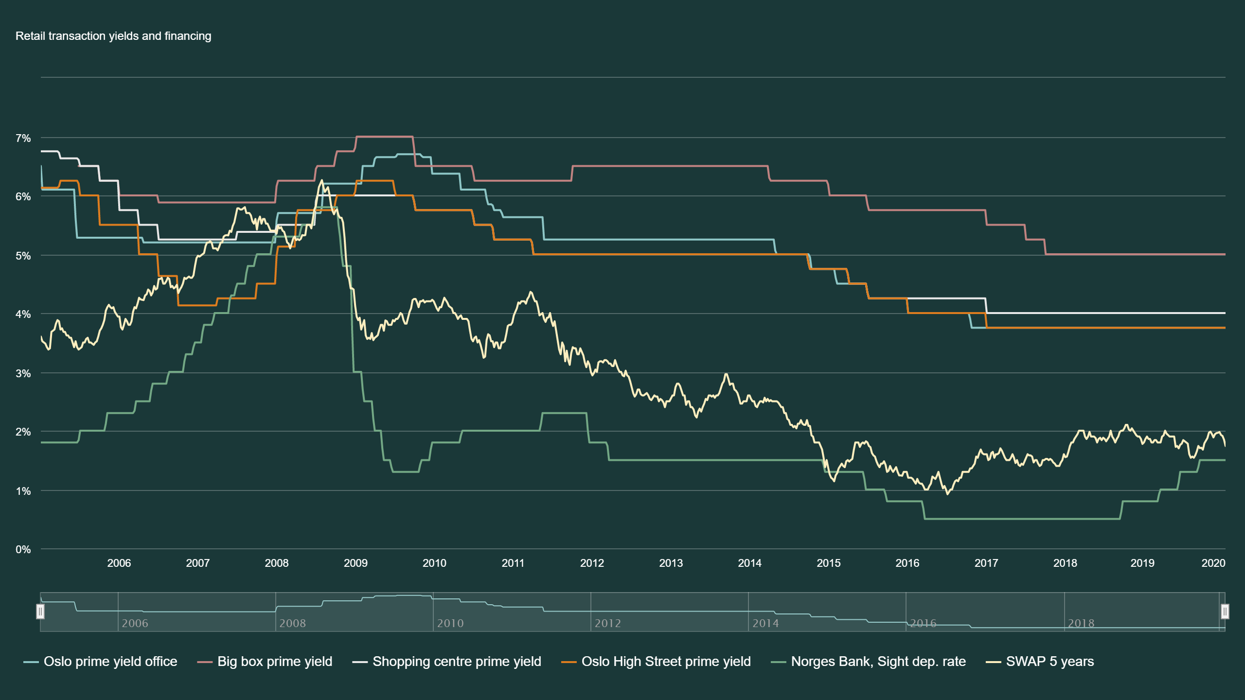 The prime yields have gone through a more profound change over the past 12 months. Average prime shopping center yields for Europe (excluding Russia) has increased by almost 50 bp over the year, equivalent to a decline of 10% of capital values. This reflects that the retailers’ problems have impacted the retail property market with full force, and the effect can also be seen in property owners’ stock prices. Other property segments, however, have stable or falling yields, so the diversified property owners do not see financial strains.