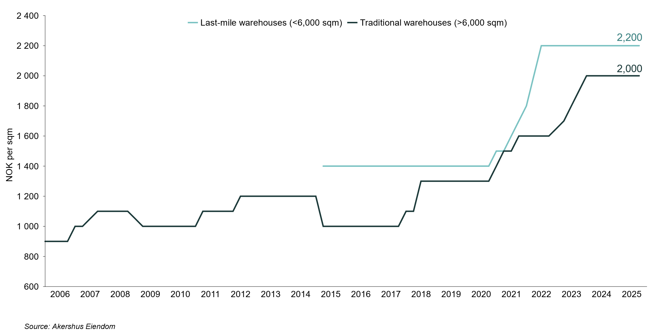 Despite increased uncertainty, more cautious occupiers and a modest rise in vacancy, rents have stabilised at high levels in Oslo. According to our observations, prime rents remain at NOK 2,000 per square meter for larger units at Alnabru and NOK 2,200 per square meter for smaller, centrally located last-mile properties.