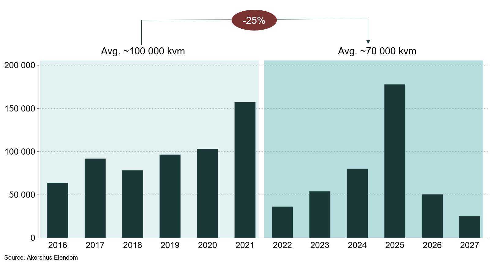 JLL data show that total office construction across Europe peaked in 2020 and has since dropped 24 per cent. A similar trend is evident in Oslo, where the average volume of new office space built between 2022 and 2027 is projected to be 25 per cent lower than in the 2016-2021 period. This is largely driven by elevated construction and financing costs, as discussed in the macro section of this analysis, which continue to weaken the profitability of new-build projects. These cost pressures are likely to persist in the short term, further limiting new office supply in the years ahead.