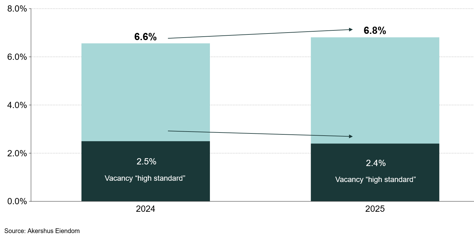 Even though new office supply is limited, demand for top-tier office space remains solid. In recent years, tenants have raised their expectations, with a clear shift towards full-service buildings offering high energy efficiency, which is a trend reflected in today’s office vacancy patterns. While overall office vacancy in Oslo has increased over the past year due to weaker demand, vacancy among space classified as “high standard” has declined over the past 12 months. This indicates that, although aggregate office demand is down, demand for the best products remains robust. Together with elevated cost levels, this has helped keep prime rents stable at high levels, despite weaker take-up and a more generous supply side. In addition, we continue to observe a steady shift towards central location among tenants, a trend we expect to persist going forward.