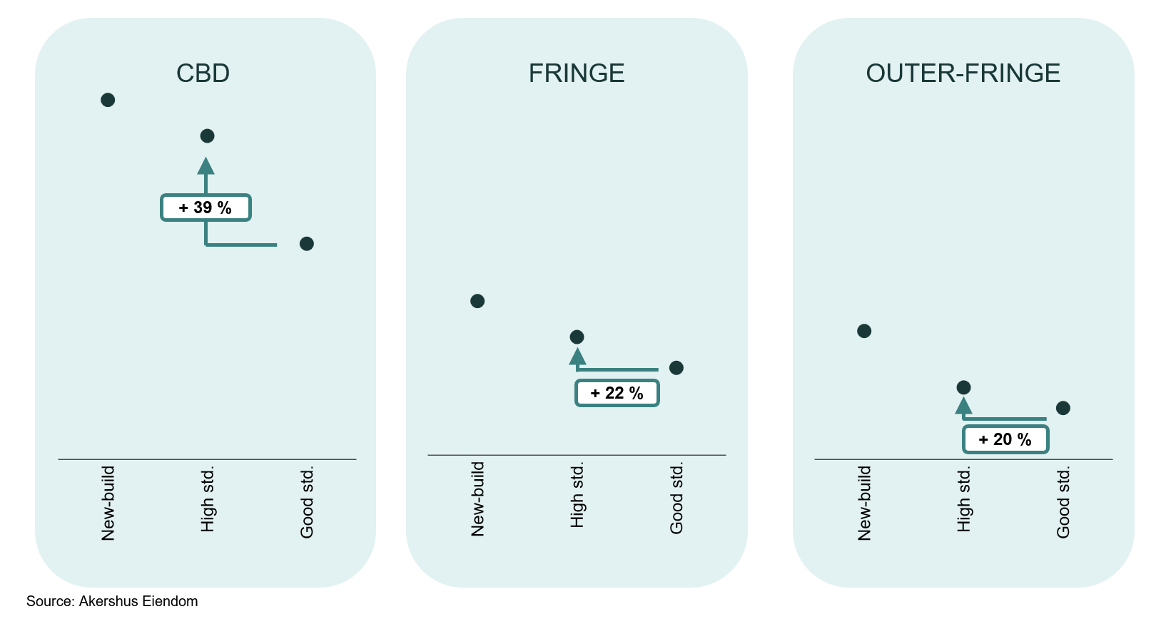 - Upgrading an office building to a significantly higher standard can generate solid rental premiums across all office submarkets in Oslo. However, in some areas, even a higher rent level will not be sufficient to make a project financially attractive due to low baseline rents.