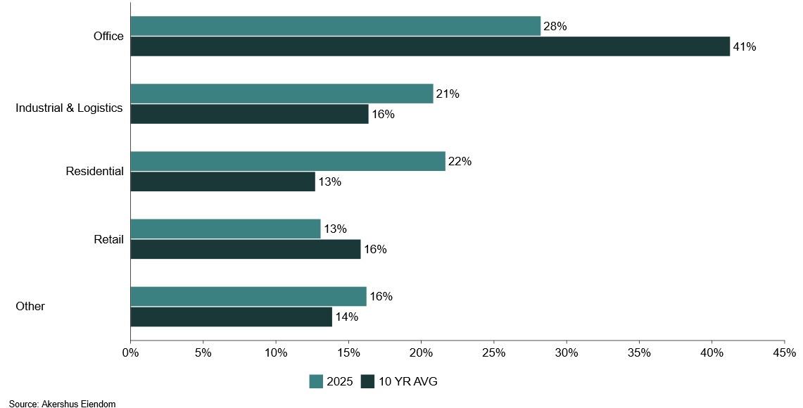 Diversification has become increasingly important in the transaction market following several years in which office assets were the dominant segment. Historically, office properties have accounted for a significant share of transaction volumes in Norway, but activity has gradually declined since the pandemic and was lower last year than in previous periods. Investors with a traditional office focus have increasingly expanded their investment mandates to include other segments. Notably, KLP has in recent years made its first investments in both logistics and residential rental housing, illustrating a clear strategic shift toward broader exposure and more diversified cash flows.