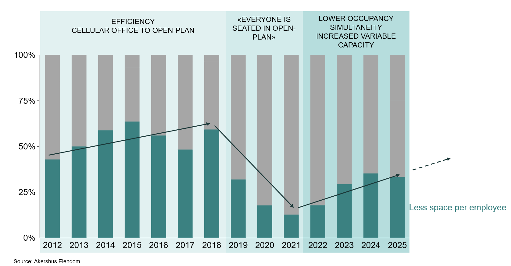 This is confirmed by our annual space requirement survey, which shows that an increasing number of companies are reducing space per employee, driven by cost focus and changing working patterns. Up until 2018, development was largely characterised by the transition from cellular offices to open-plan layouts, enabling more efficient use of space. As this transition has largely been completed, further efficiency gains are increasingly achieved through higher levels of variable capacity. Our experience from recently signed leases indicates that many occupiers now assume a simultaneity rate of approximately 70 per cent. This implies that companies plan for fewer workstations than total headcount. Solutions such as free seating and activity-based workplace concepts are increasingly adopted to better align office space with actual use.