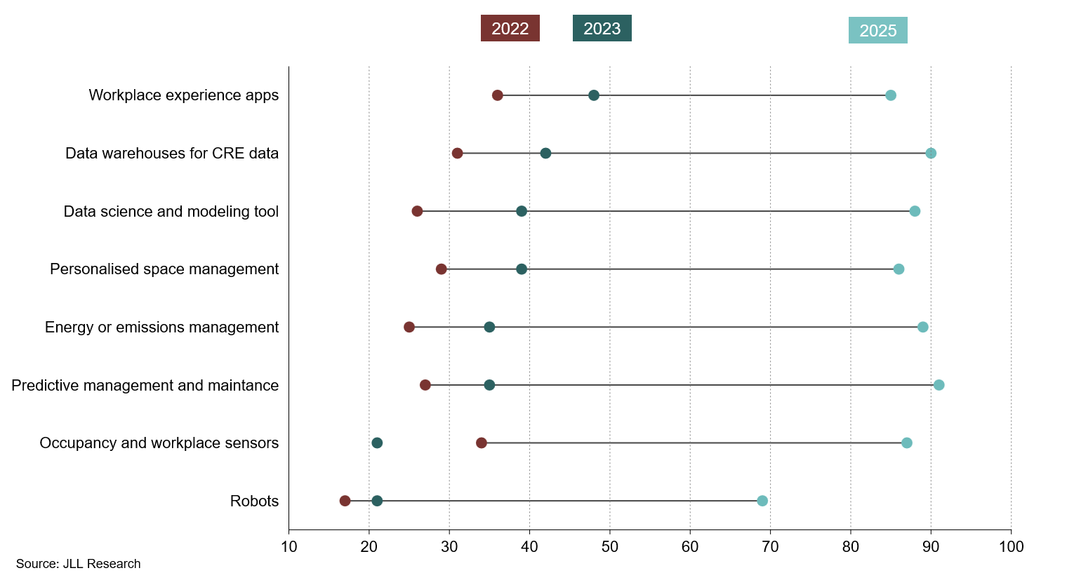 According to a recent analysis by JLL, interest in AI within the real estate sector has accelerated rapidly, with most industry participants now adopting various AI tools. Technologies related to workplace optimisation now show adoption rates above 80 per cent, including tools for predictive control and maintenance, data management, and platforms for energy and emissions management. This indicates that operational efficiency, including cost reduction, currently represents the primary focus of AI investment.