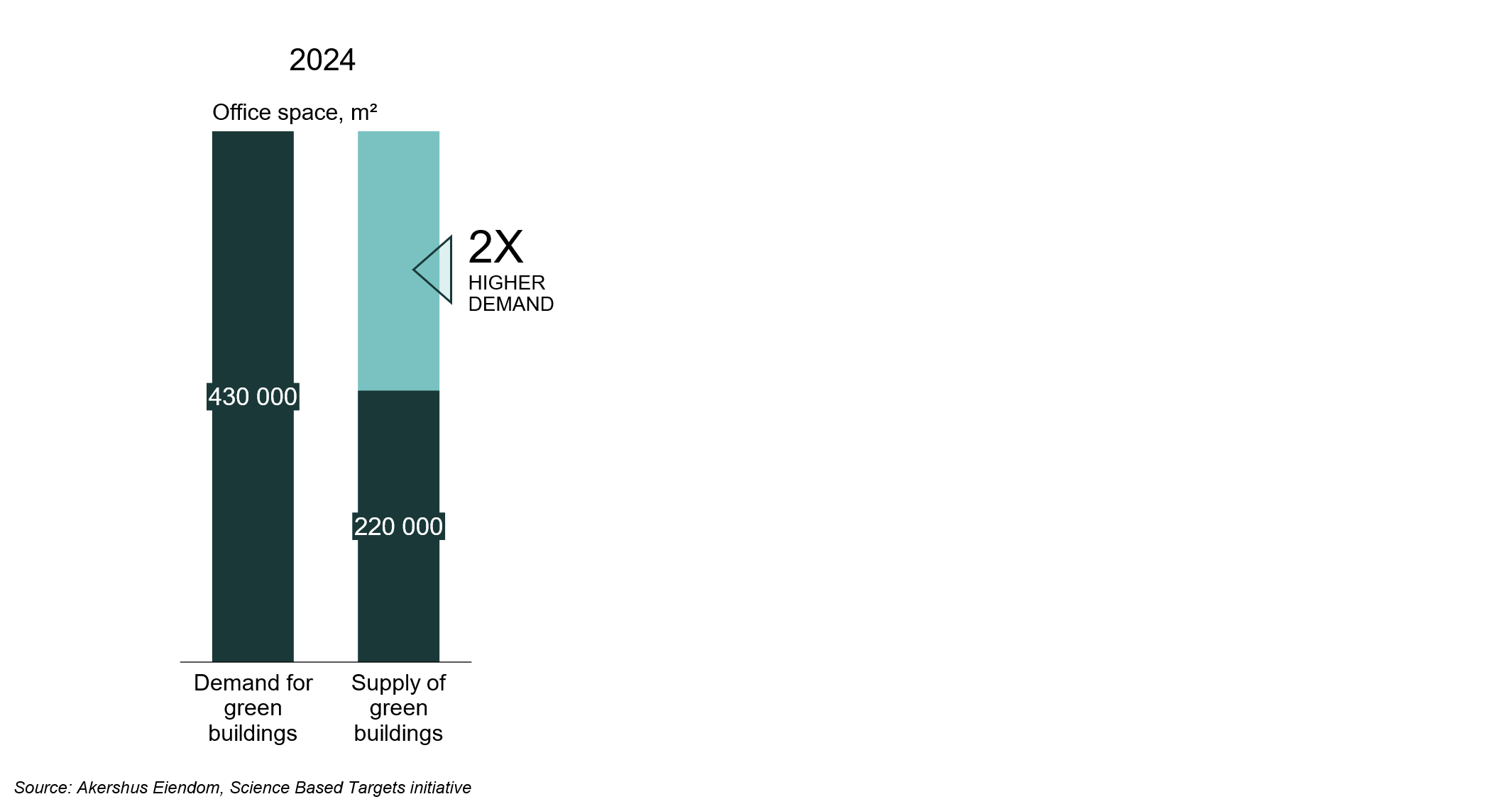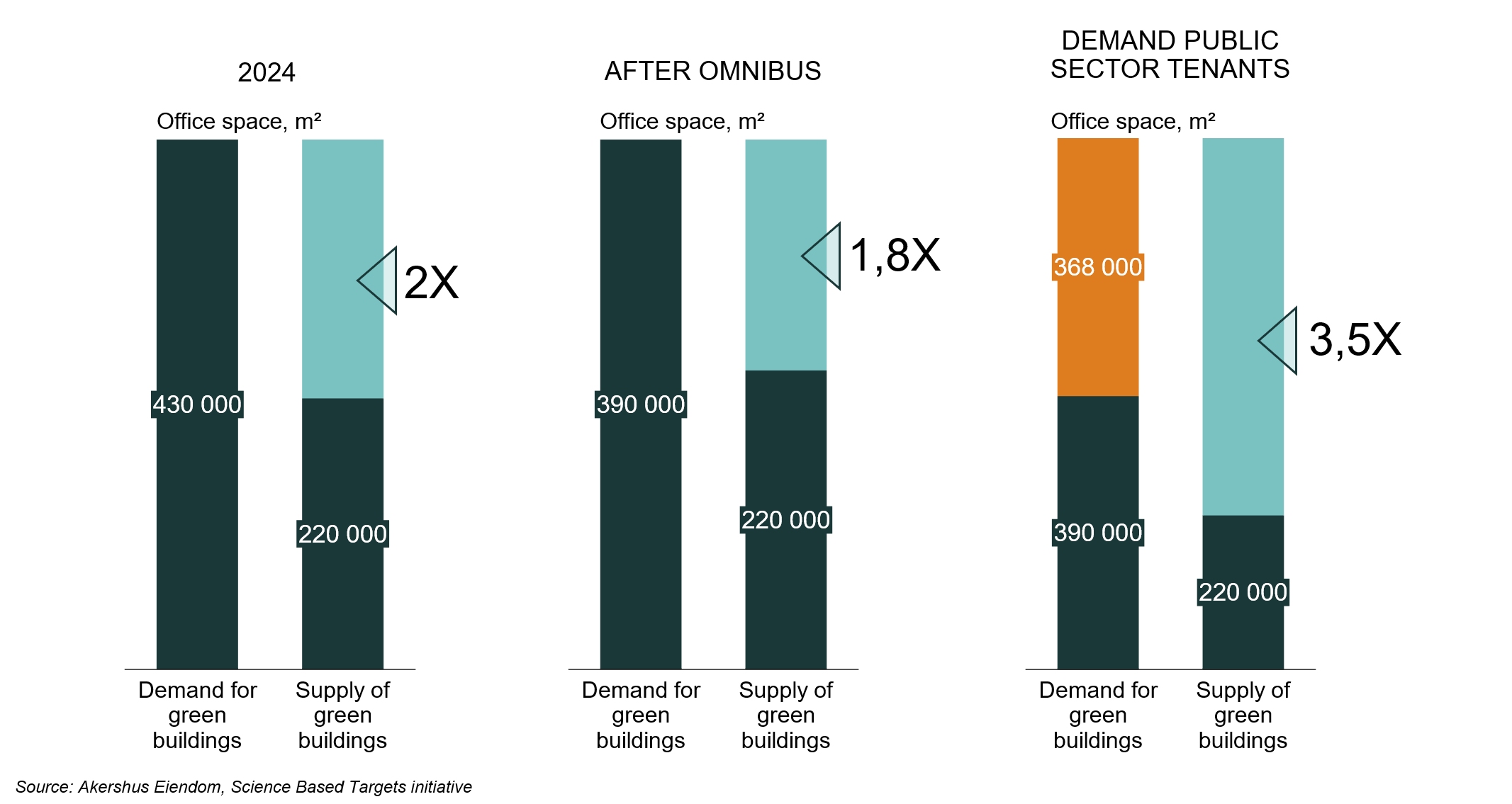 - If public sector office tenants in Oslo also begin demanding taxonomy-compliant buildings, demand could rise to as much as 3.5 times the expected supply.