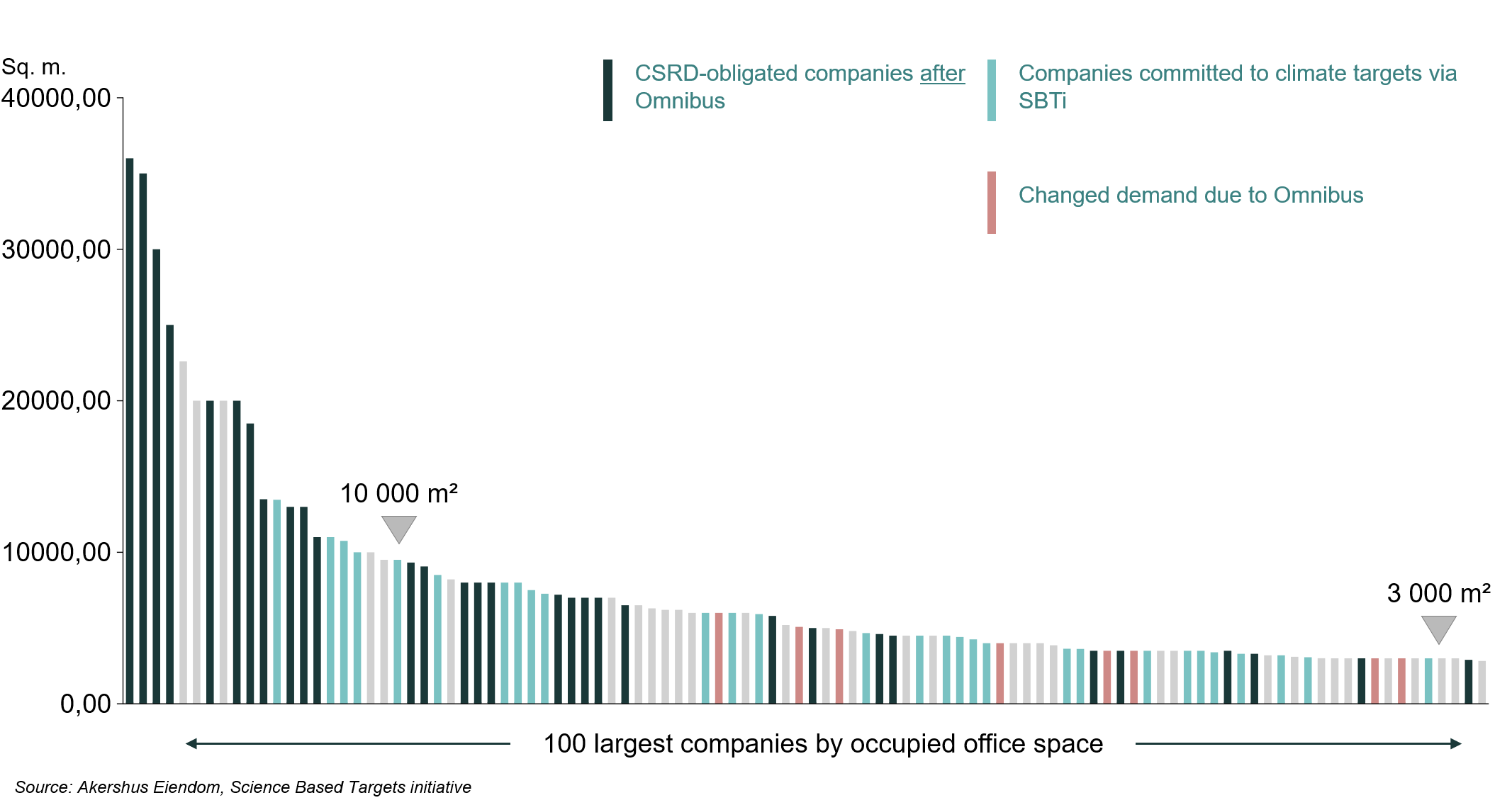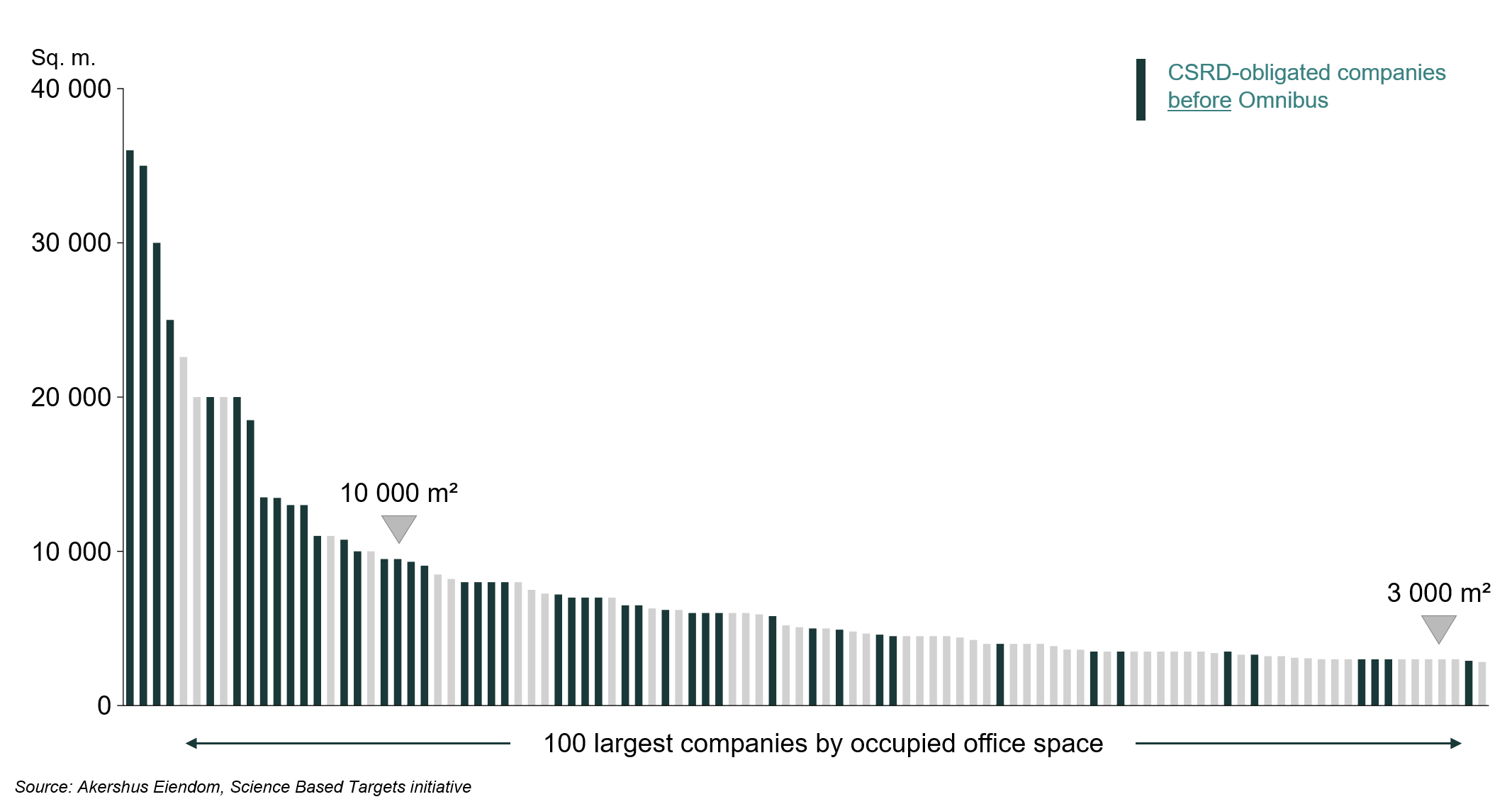Figure 3: 50 of the 100 largest companies by office area in Oslo were slated to report under CSRD before the Omnibus proposal