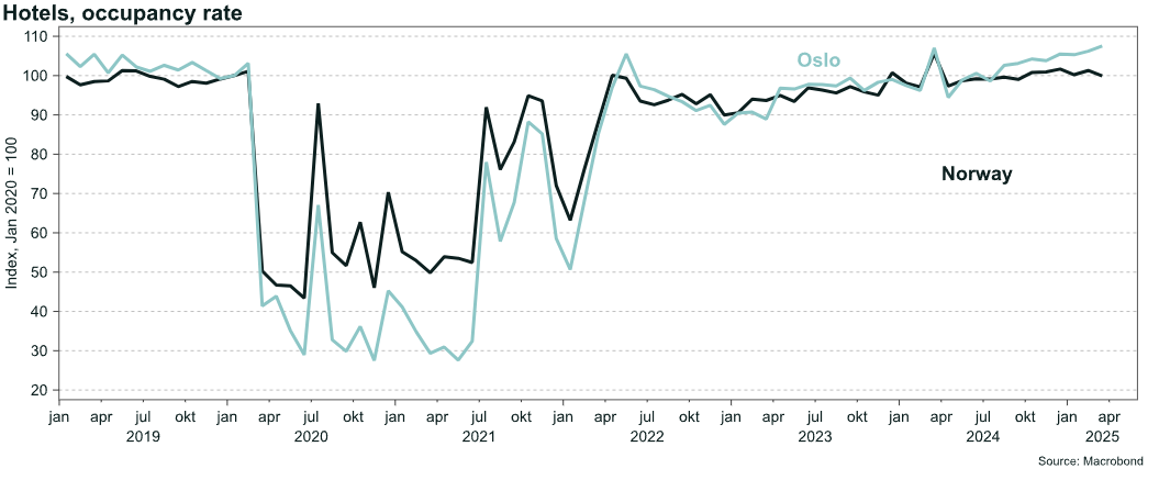 - Visitor numbers at Norwegian hotels have recovered strongly since the pandemic, with holiday-related occupancy now significantly higher than pre-pandemic levels.
