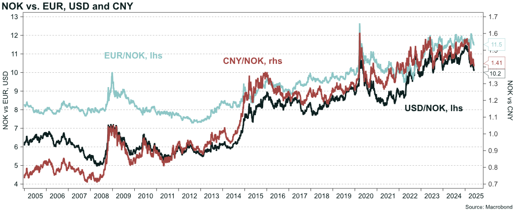 Historically, the krone’s depreciation began around 2013, when oil investments peaked as a share of the Norwegian economy. Since then, the currency has followed a generally weakening trend. From the beginning of 2013 to today, the krone has depreciated by approximately 60, 70, and 90 per cent against the euro, Chinese yuan, and US dollar, respectively. Going forward, the krone may strengthen somewhat, but it is widely expected to remain at a lower level than in previous decades.