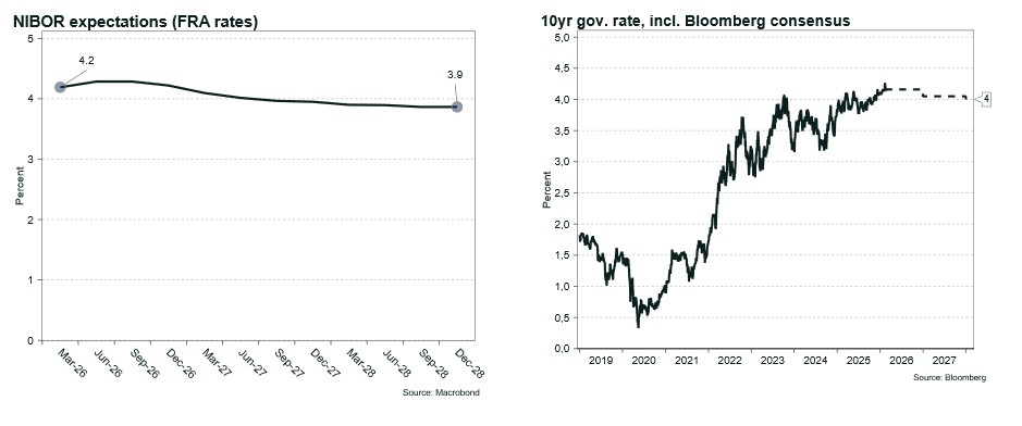 NIBOR is currently at 4.2 per cent, while the policy rate stands at 4.0 per cent. Pricing in the FRA market suggests that only one rate cut is expected from the central bank over the next three years, implying a decline in NIBOR to around 3.9 per cent.