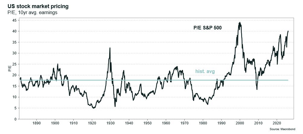 Valuations in the US equity market have become increasingly stretched. Measured as share prices relative to average earnings over the past ten years for S&P 500 companies, this metric has not been higher since just prior to the bursting of the dot-com bubble in the early 2000s. As a result, there is growing concern in the market that the AI bubble could burst, triggering a broader equity market correction.