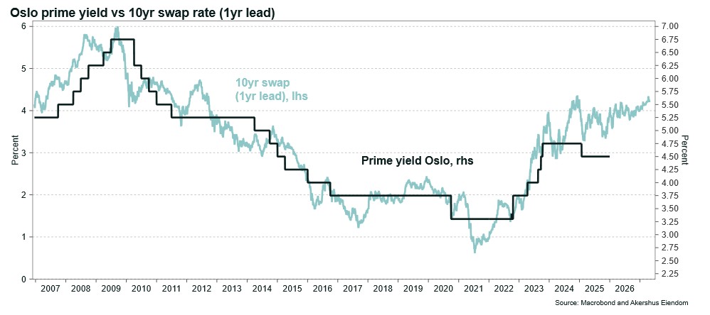 Market participants expect interest rates in Norway to remain elevated over the coming years. At the same time, concerns about a potential correction in equity markets have intensified. In our view, these factors represent a risk to commercial real estate pricing going forward.
