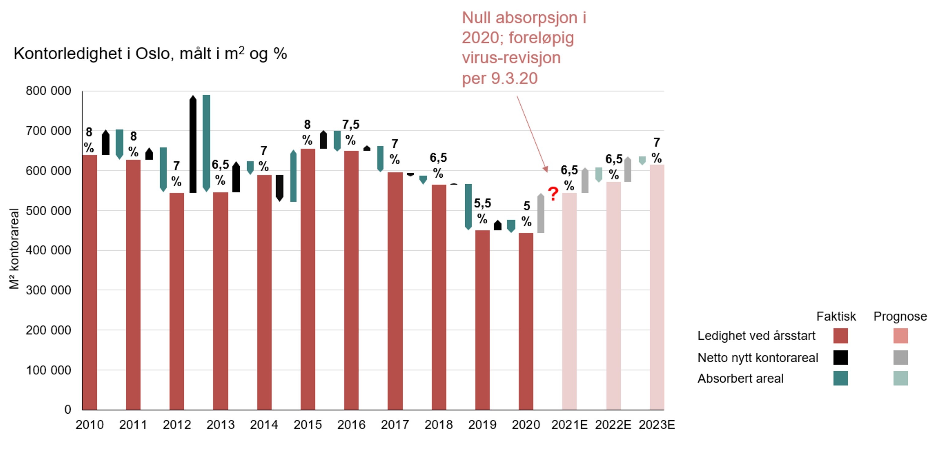 I våre prognoser legger vi (per 9. mars 2020) til grunn at netto absorbert areal vil være null for inneværende år, før etterspørselen vil ta seg opp noe. Basert på dette anslår vi at kontorledigheten i Oslo vil øke til 6,5 % ved inngangen av 2021 og deretter til rundt 7 % i 2023.