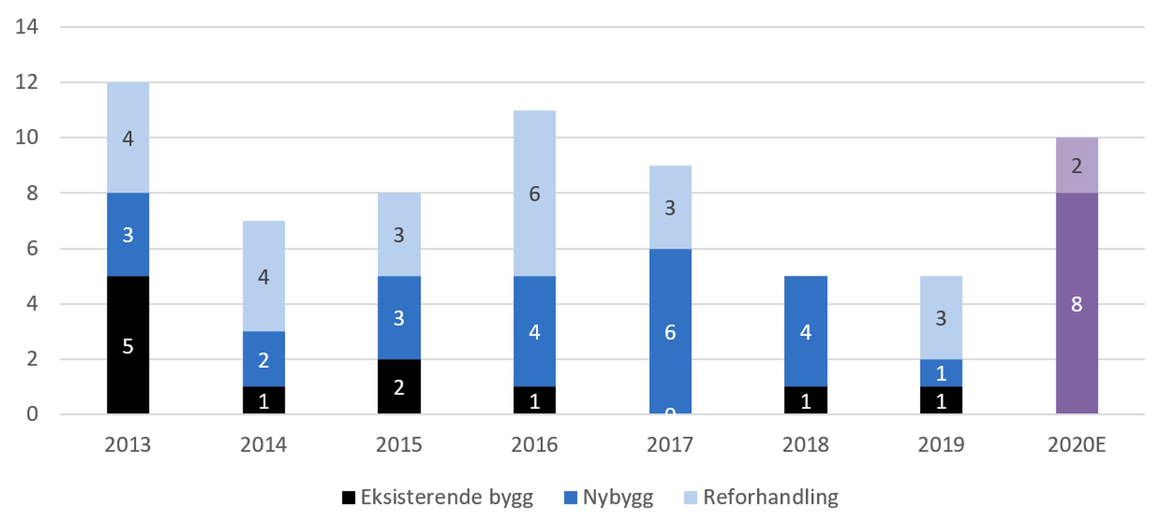 I løpet av året kom det inn 8 nye søk, mens 3 av søkene vi hadde på starten av året reforhandlet eller signerte, slik at vi nå ser hele 21 aktive søk på 10.000 m² eller mer. Med de nye søkene har vi fire innenfor Bank/Finans/Juridisk og seks offentlige aktører. Basert på når leietakerne trenger lokalene de søker, ser vi for oss at det signeres mellom 8 og 10 kontrakter i løpet av 2020, med andre ord har det potensiale til å bli det beste året for store nye kontrakter siden 2013, dersom de fleste flytter. Grafen under illustrerer dette, der antall kontrakter over 10.000 m² per år er angitt.
