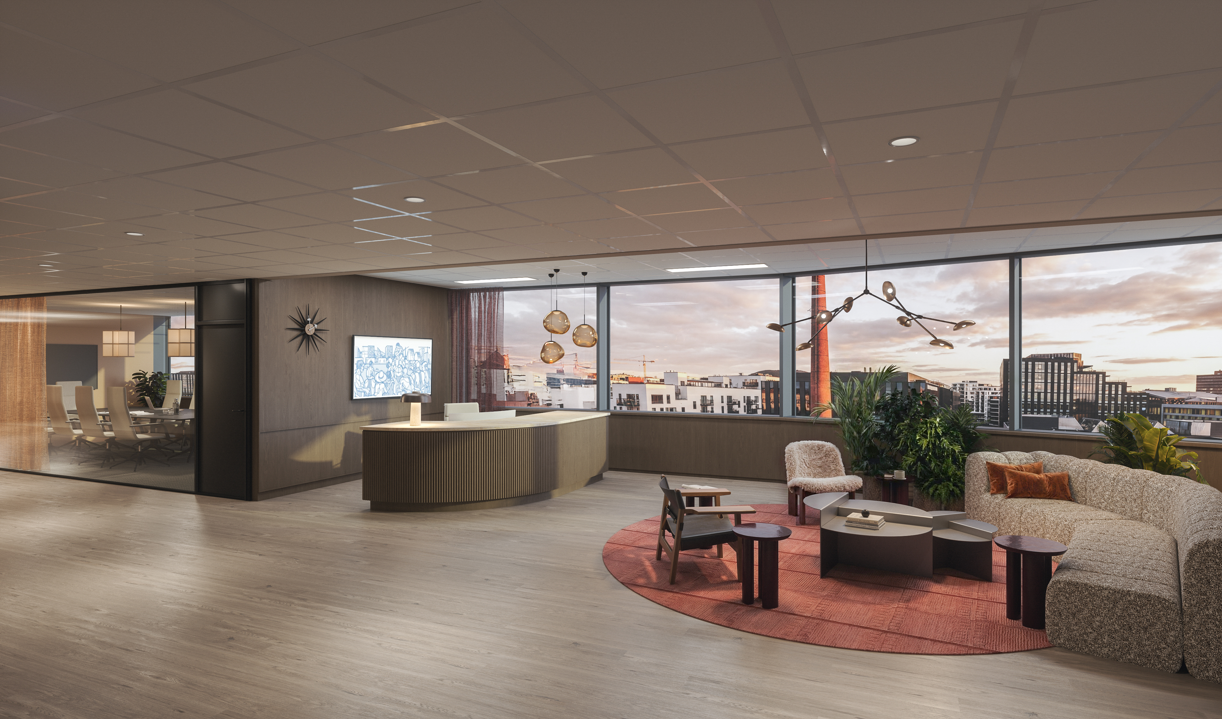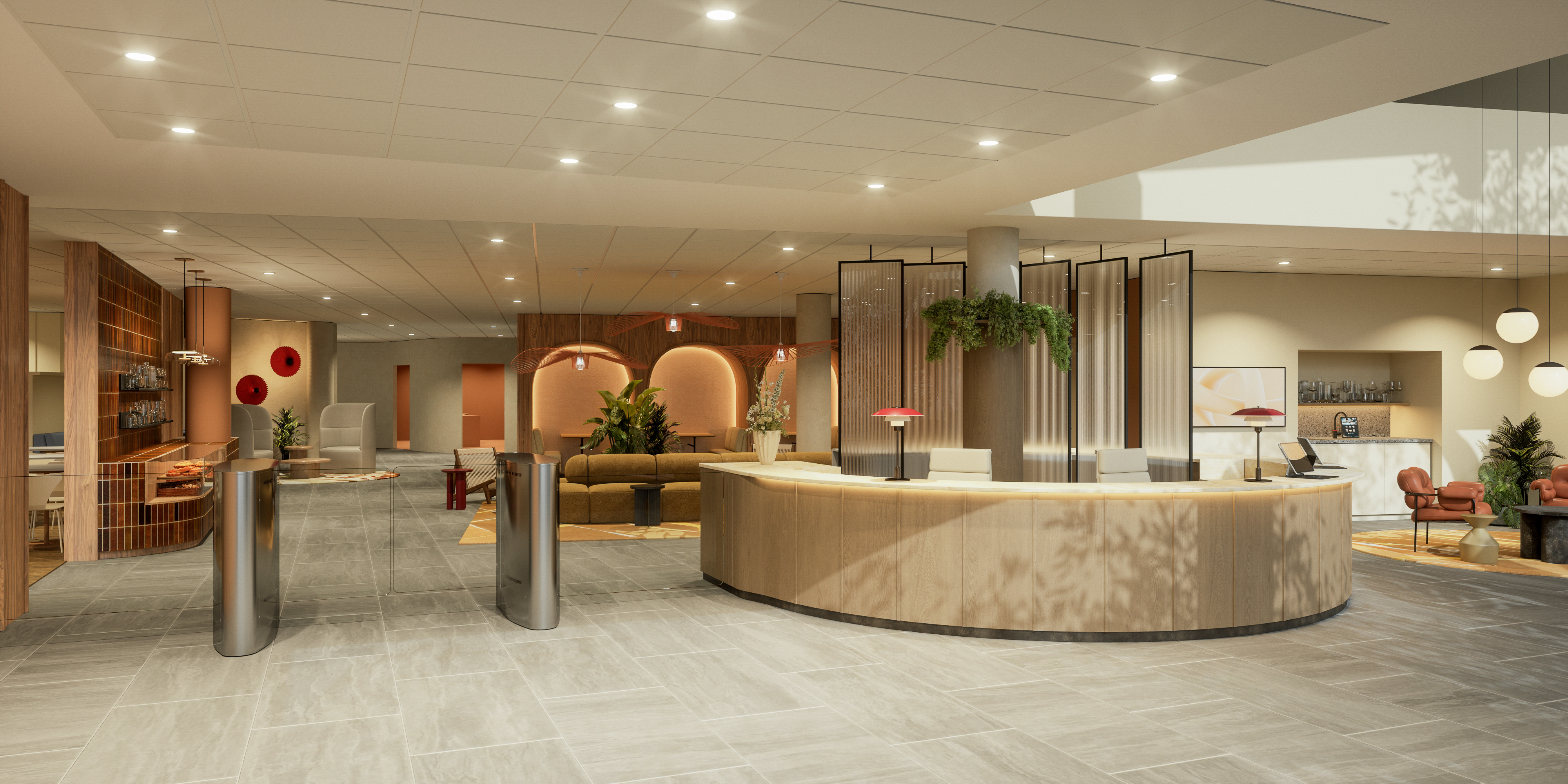 Flott oppgradet felles resepsjon og bedriftsrestaurant, dusj/garderobe og sykkelparkering.