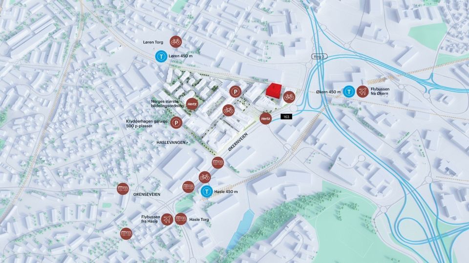 Hasle, Økern og Løren T-banestasjon (linje 4 og 5), busslinje: 60, 67, 23, 24, 21, 28 og Flybuss.