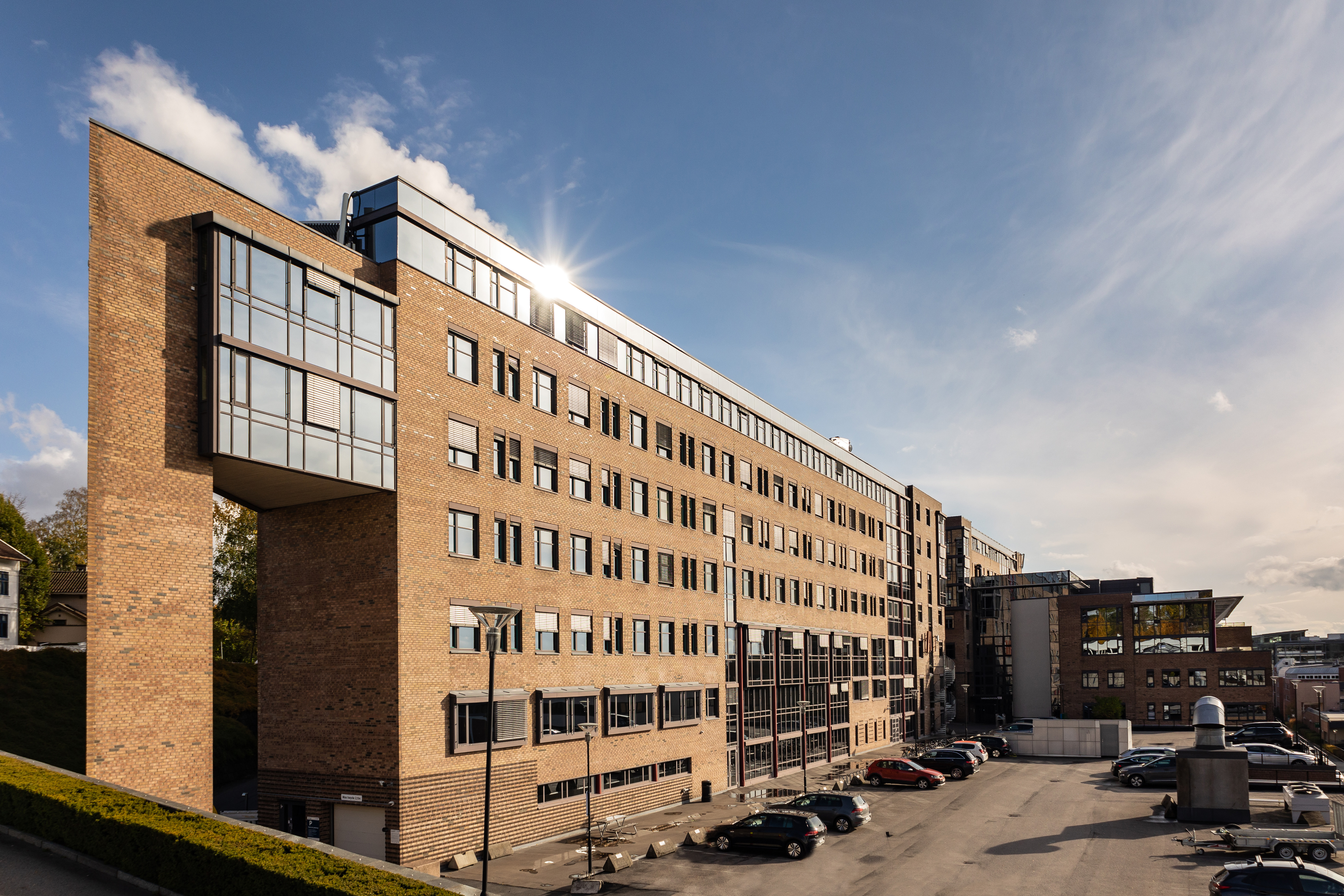 Den moderne bygningen er oppført i solid tegl og har et tydelig arkitektonisk uttrykk, preget av industrielle linjer og store glassflater. Bygget tilbyr et rikt tilbud av tjenestetilbud.