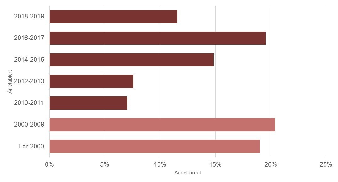Grafen under viser leietakerareal-andelene sortert per etableringsdato, der de siste 10 årene har fått fem to-års-grupper.