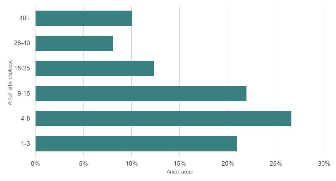 Ser man imidlertid på andel av det totale arealet leid hos de ulike sentrene, utgjør de små bedriftene mindre enn 50 % av arealet, noe som betyr at middelstore og større selskaper også ser fordeler med flex-kontor – og de er i sum viktigere, for de leier mer.