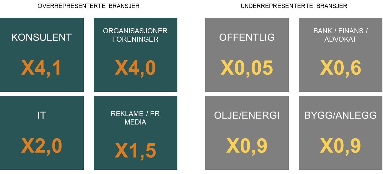For å forstå dette resultatet bedre, sammenlignet vi hvordan de ulike bransjene i utvalget er representert i forhold til det totale utleiemarkedet. Overrepresenterte bransjer er konsulent (x4,1), organisasjoner og foreninger (x4,0), IT/kommunikasjon (x2,0) og Reklame/PR/Media (x1,5), mens underrepresenterte bransjer er bank/finans/advokat (x0,6) og offentlige brukere, der andelen kun er 0,05 av den gjennomsnittlige andelen i markedet. Det må nevnes at storparten av arealet som leies av offentlige brukere er svært store arealer på 10.000 m2 eller mer.