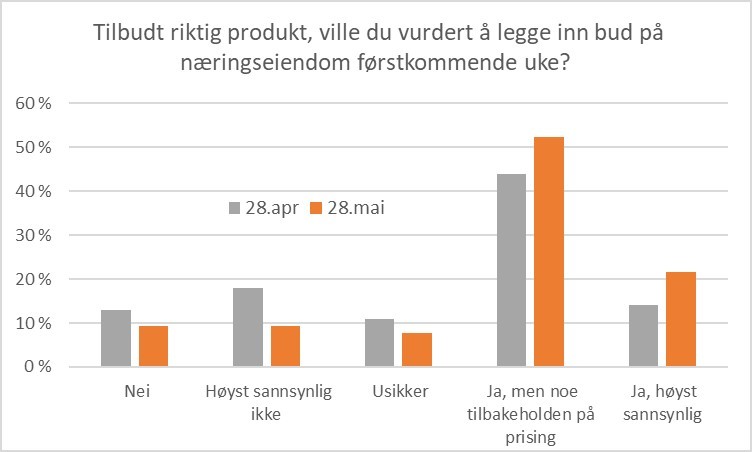Storparten av de som vil kjøpe svarer «Ja, men noe tilbakeholden på prising», noe som ikke overraskende og delvis en type svar man ville sett uansett. I samtaler med kunder og kontakter har vi av og til hørt at man håper på en «corona-rabatt», men det har vi så å si ikke sett eksempler på i faktiske transaksjoner.