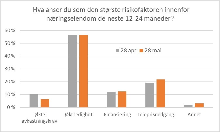 Det er også interessant at oppfatningen av hvor risikoen ligger, nesten ikke har flyttet seg siden mai. Leieprisnedgang nevnes av noen flere i slutten av mai sammenlignet med april, mens kun 6 % nå frykter økte avkastningskrav, og 13 % ser på finansiering som risiko; det betyr at bankenes og myndighetenes signaler oppleves betryggende for denne faktoren. Basert på dette, tror vi at krisens etterspill skiller seg vesentlig fra 2008-09-perioden.