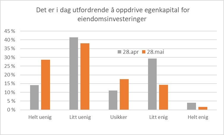 Målingen har tre kapitalkategorier: egenkapital, obligasjoner og banklån. For egenkapital er stemningen best, og den har endret seg mest i positiv retning gjennom mai. Hele to av tre i utvalget mener nå at det ikke er utfordrende å innhente egenkapital til eiendomsinvesteringer.