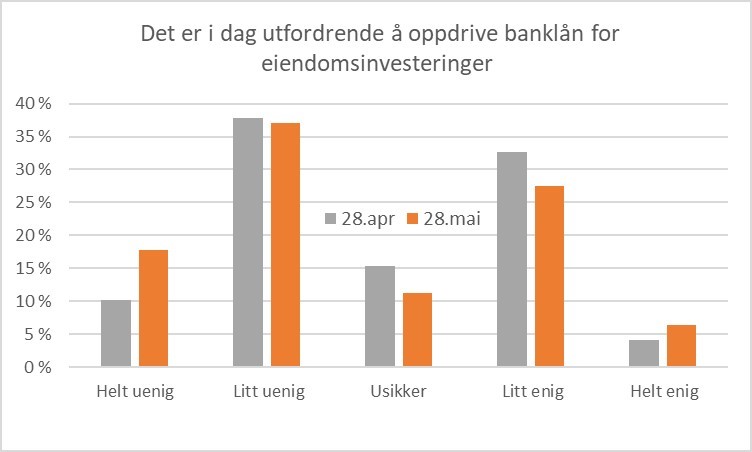 Svarene kan tolkes til å stå litt i motsetning til bankenes uttalte villighet til å være med på eiendomsinvesteringer, ettersom 1/3 ser på kapitalinnhenting som «utfordrende». Det er vanskelig å tolke dette som et problem, ettersom oppfatningen av «utfordrende» vil være subjektivt vurdert.