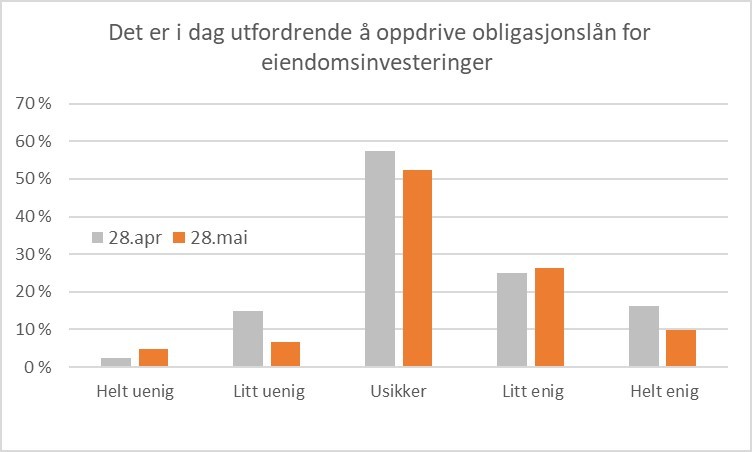For obligasjoner er usikkerheten større og ganske stabil i løpet av mai, noe som kan skyldes at flere av aktørene ikke har benyttet seg av dette før krisen. Obligasjoner med kredittrating under «Investment Grade» har også falt en del i verdi, og det forklarer nok at relativt sett flere er enige i at det er vanskeligere å skaffe kapital på denne måten.