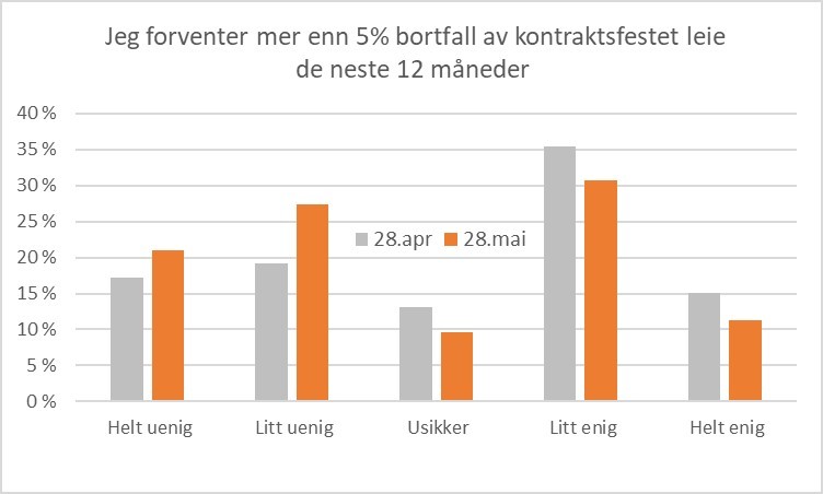 Tapt leie har vært svært omtalt i media, og har vært et åpenbart problem for investorer med mye handelseiendom. Endringen i svarene fra april til mai tyder på at mange aktører ikke har merket problemer med leietakernes betalingsevne, og at en del (10-15 %) har endret oppfatning til det positive gjennom mai. Dette skyldes nok også at de mye omtalte problemene i handel og hotell er konsentrert hos et relativt lite antall aktører. Fordelingen av svar basert på oppgitt hovedsektor – kontor, handel, logistikk eller annet – viser at svarene er ganske like på tvers av sektorer.