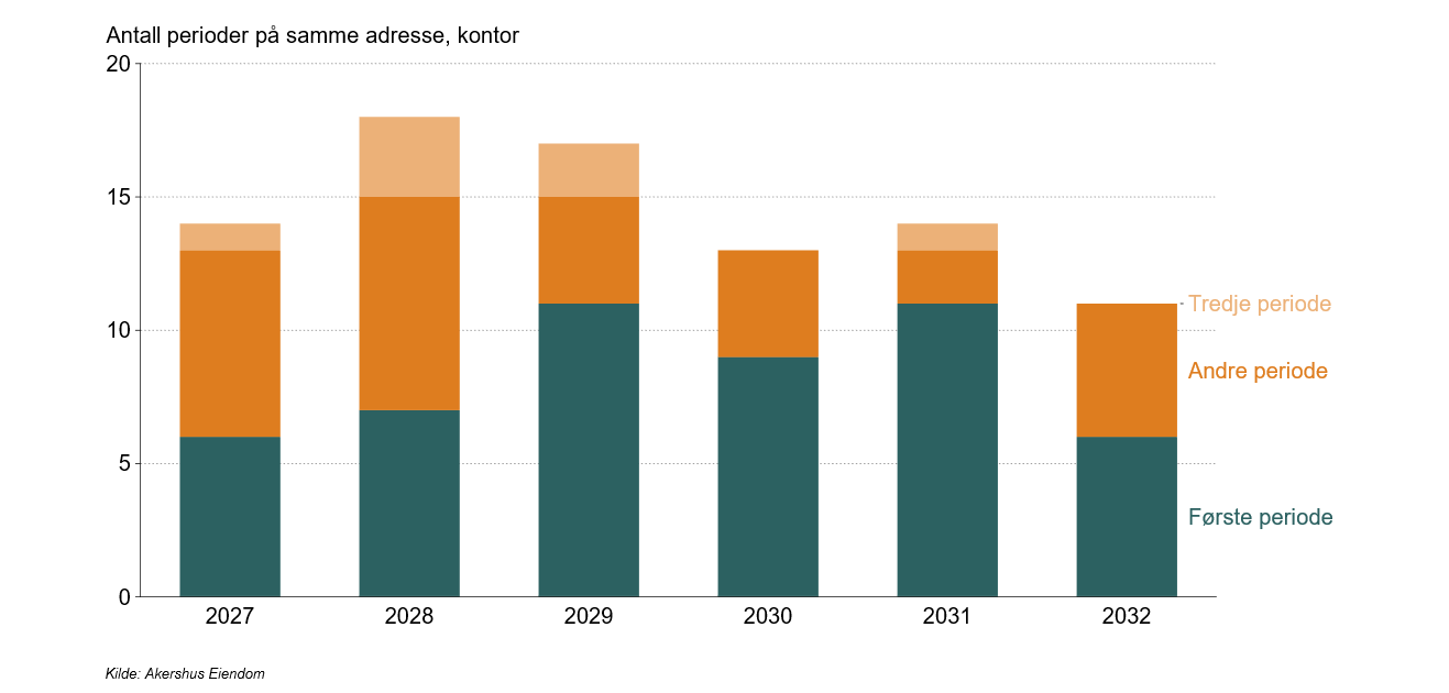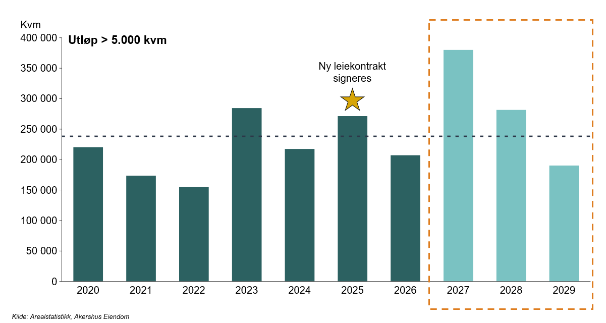 Samtidig melder Arealstatistikk om høye utløpsvolumer i 2027 og 2028, og flere store selskaper med et arealbehov på 5.000 kvadratmeter eller mer løper ut disse årene. Flere av disse leietakerne er allerede aktive i markedet, og det er grunn til å tro at flere av disse vil inngå nye leiekontrakter eller reforhandle i løpet av inneværende år eller i 2026 og dermed bidra til økte signerigsvolumer.